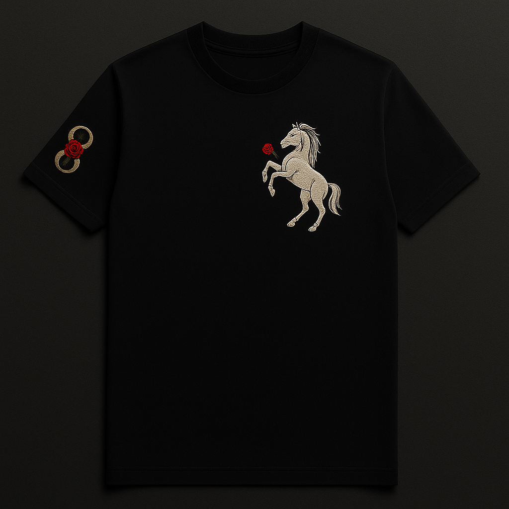 Featuring our iconic silver stallion and red rose embroidery, this tee speaks of elegance, resilience, and legacy. The embroidered “8” and rose on the sleeve symbolize infinite potential and timeless loyalty.